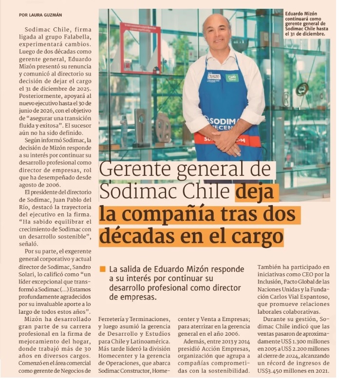 Te invito a leer la noticia "Gerente general de Sodimac Chile deja la compañía tras dos décadas en el cargo " en Update Comunica. https://updatecomunicaciones.cl/update/noticia/299386 Atentamente,